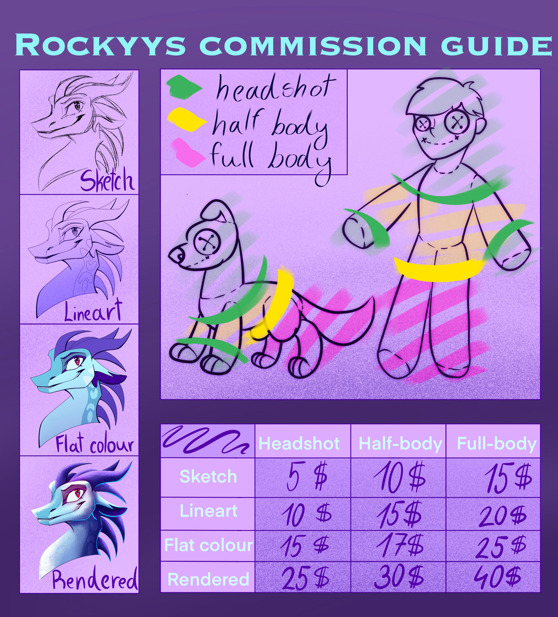 To calculate the price take how much of the character would be visible (headshot/half-body/fullbody) and how the art will be drawn (sketch/lined/flat-color/rendered)For example - two rendered fullbody characters